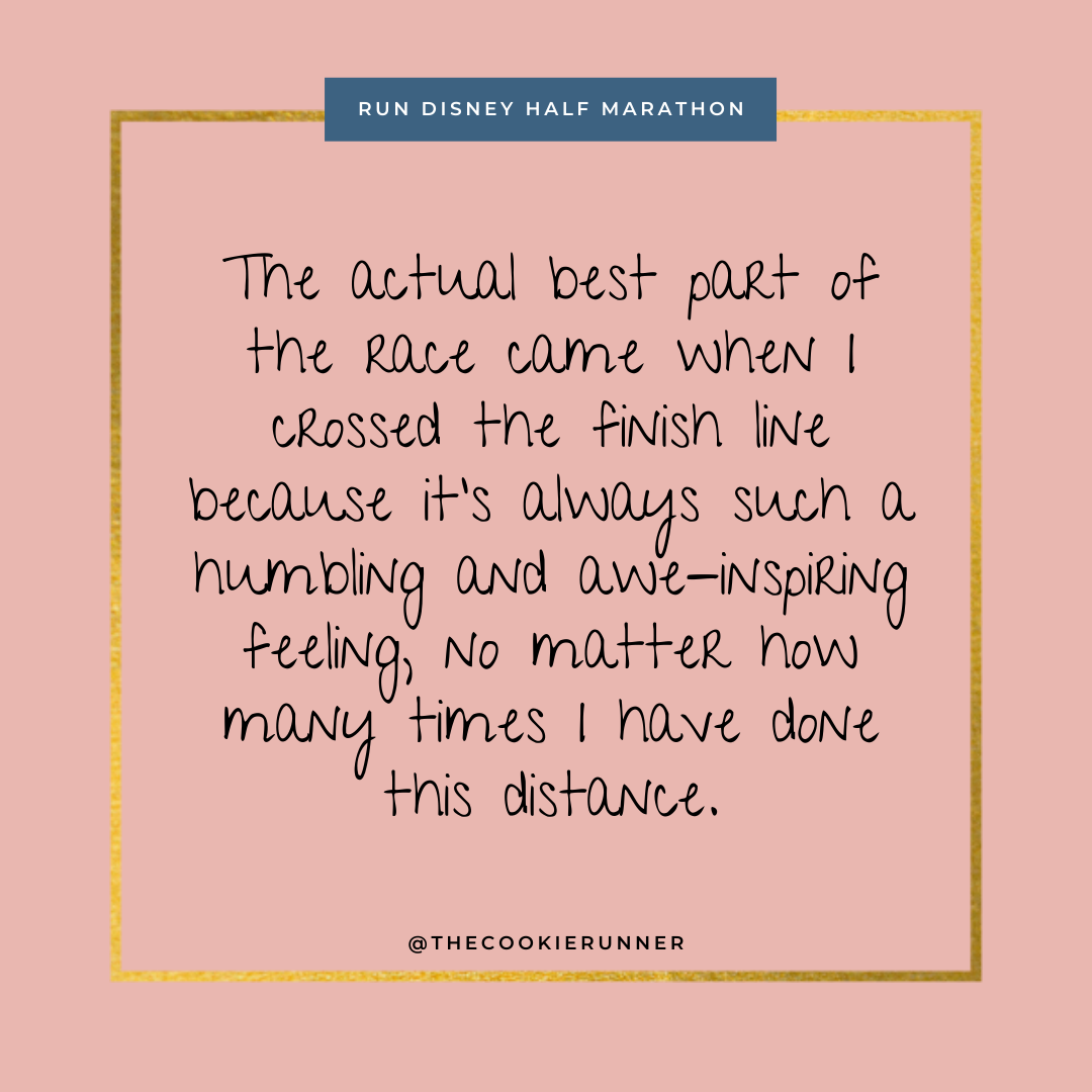 Did I have fun? I sure did! How can you not have fun at a Disney race when you get to take sweaty photos with Disney characters? I mean, miles 9-12 were rough because there were no character stops for me, but the knowledge that a character stop would eventually come kept me moving forward. The second-best part of the race came right before entering Epcot when I spotted the funniest Kim Kardashian-Pete Davidson sign and stopped to take a picture with it. The actual best part of the race came when I crossed the finish line because it’s always such a humbling and awe-inspiring feeling, no matter how many times I have done this distance.